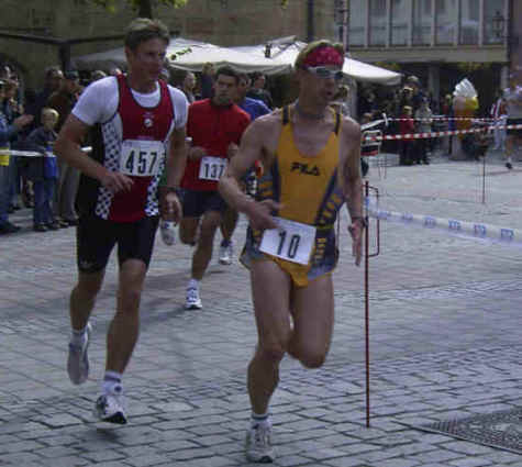 locker und hatte nach einer Runde auch meinen Rhythmus gefunden. Ein Zuruf von Straßenrand: Platz 17. Doch plötzlich ein Schmerz im rechten Oberschenkel. Etwas Tempo raus, rollen lassen. Zurufe von Hans Seeger: Los
