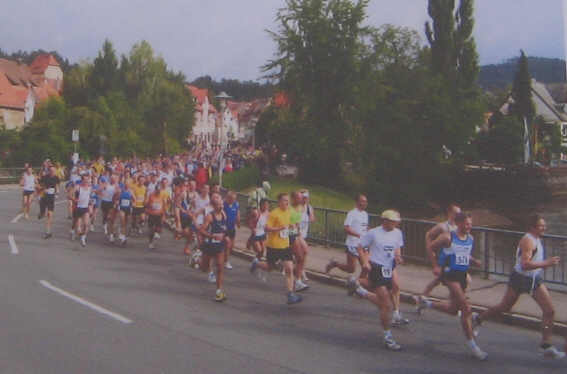 Teilweise störte zwar der wind, es blieb aber trocken und bei Temperaturen von unter 15 Grad hatte ich nichts auszusetzen. Wollte der Kopf nicht? Nach 19:04 bei 5 km hatte ich den Kampf wohl innerlich aufgegeben, Eine gute Zeit war eh nicht mehr drin, es bestand kein Mannschaftszwang und im Hinterkopf war auch schon Roth am kommenden Sonntag, dann wohl mit Mannschaftszwang, Also Kräfte sparen… Oder ist vielleicht irgendetwas in meinem Körper, von dem ich noch nicht weiß? Die bekannten Probleme, die Blase und ein wunder Zeh, machten mir ja keine Probleme. Habe ich mich vielleicht noch immer nicht von der Spätschichtwoche Ende Juli erholt, als mein Körper wirklich nicht mehr wollte… Oder lässt die Strecke nicht mehr zu…? Im Gegensatz zu 2002, als ich dort 37:29 lief, war die Fußgängerbrücke drei- statt zweimal und das Kopfsteinpflaster in der Altstadt drei- statt einmal zu absolvieren. Vielleicht kam alles zur gleichen Zeit…
