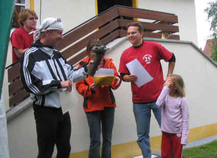 Kurzes Erholen, Auslaufen, Umziehen im Feuerwehrhaus, Kaffee und Kuchen, Siegerehrung, Als Preis gab es kein Blech, sondern etwas aus Ton. Ein Mitläufer