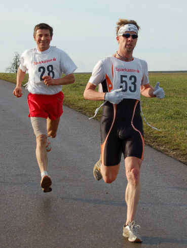 Windschatten laufen zu können. Am Ende der Startbahn setzte sich dann Volker doch ab und wurde schließlich Zweiter, dafür schloss Fritz Edelmann zu mir auf. Zusammen gingen wir