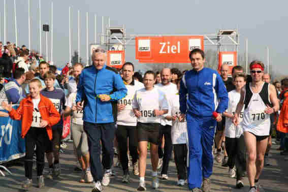 etliche Körperkontakte, da die Zuschauer natürlich noch nicht mit im Minutentakt eintreffenden Läufer rechneten. Und die 10km-Walker konplettierten das Durcheinander. Vor der Tribüne der