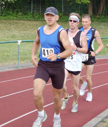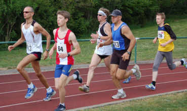 standen am Start zu den fünf Stadionrunden. Alles einen Meter hinter die Linie, auf Kommando vorrücken, der Schuss. Gedränge auf der ersten halben Runde. Der Röthenbacher Simon Schwarz, der am Ende in