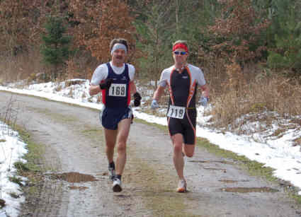 Gemeinsamt bestritten wir nun die ersten vier Kilometer nach Wittenbach und zurück und mitten im Wald stand Florian und machte das Bild der beiden Sportredakteure. Wir waren schon öfter in einem Rennen, aber